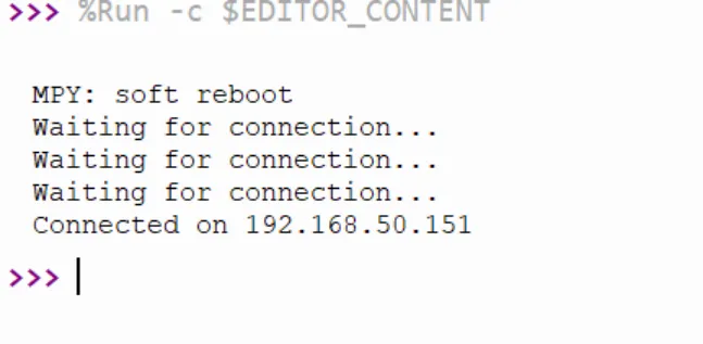 print('Connected on {ip}'.format(ip=wlan.ifconfig()[0])) # Print the IP address