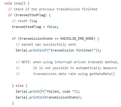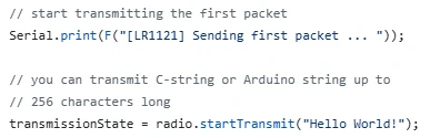 This code first prints a prompt message via the serial port to indicate that the first data packet is being sent. Then, it calls the "startTransmit" function to start the LoRa asynchronous transmission, sends the string "Hello World!" and saves the transmission status to the "transmissionState" variable.