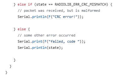 This code first sets the LoRa preamble length of the LR1121 module to 16. If the check fails, it will report an error and freeze. Then, it turns off the CRC data verification function and also verifies the configuration result. If it fails again, it will output an error and enter an infinite loop.