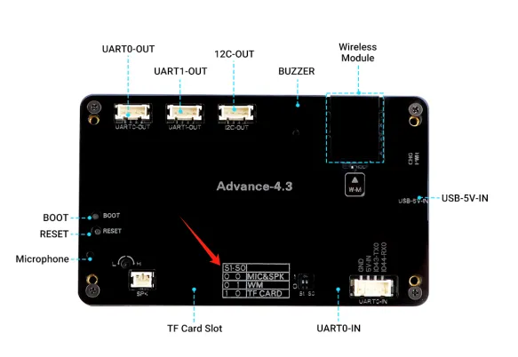 When using the UART1-OUT interface, please set the switch dial to 0 1 mode, as the wireless module and the UART1-OUT line are controlled together. (For 4.3 size, 5.0 size, 7.0 size)¶