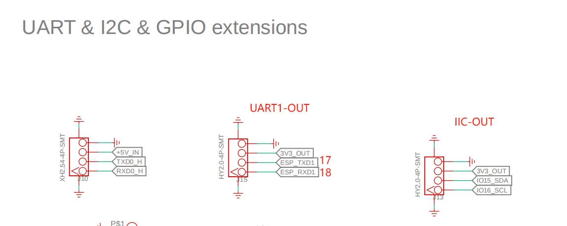 I2C-OUT interface: connects RTC chip, extended IO chip (for screen backlight, touch screen reset, power amplifier pin control) and wireless module, only supports I2C communication.