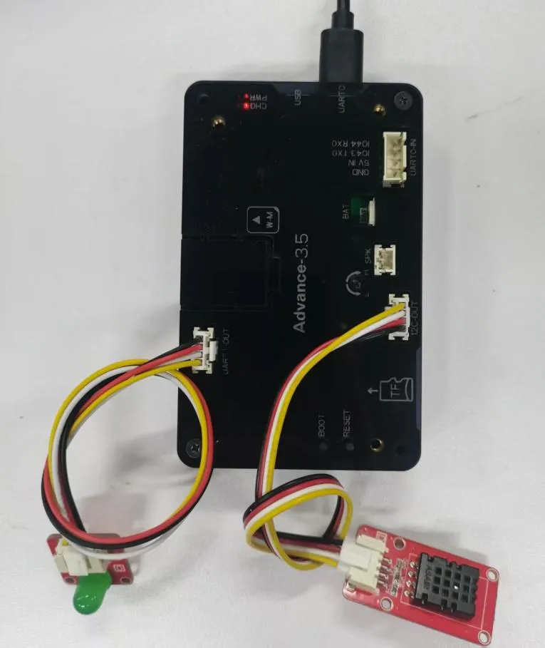 This lesson will use the IIC interface and UART1-OUT interface of this series of products to collect data from temperature and humidity sensors. When the temperature exceeds the threshold, the light bulb will automatically light up.