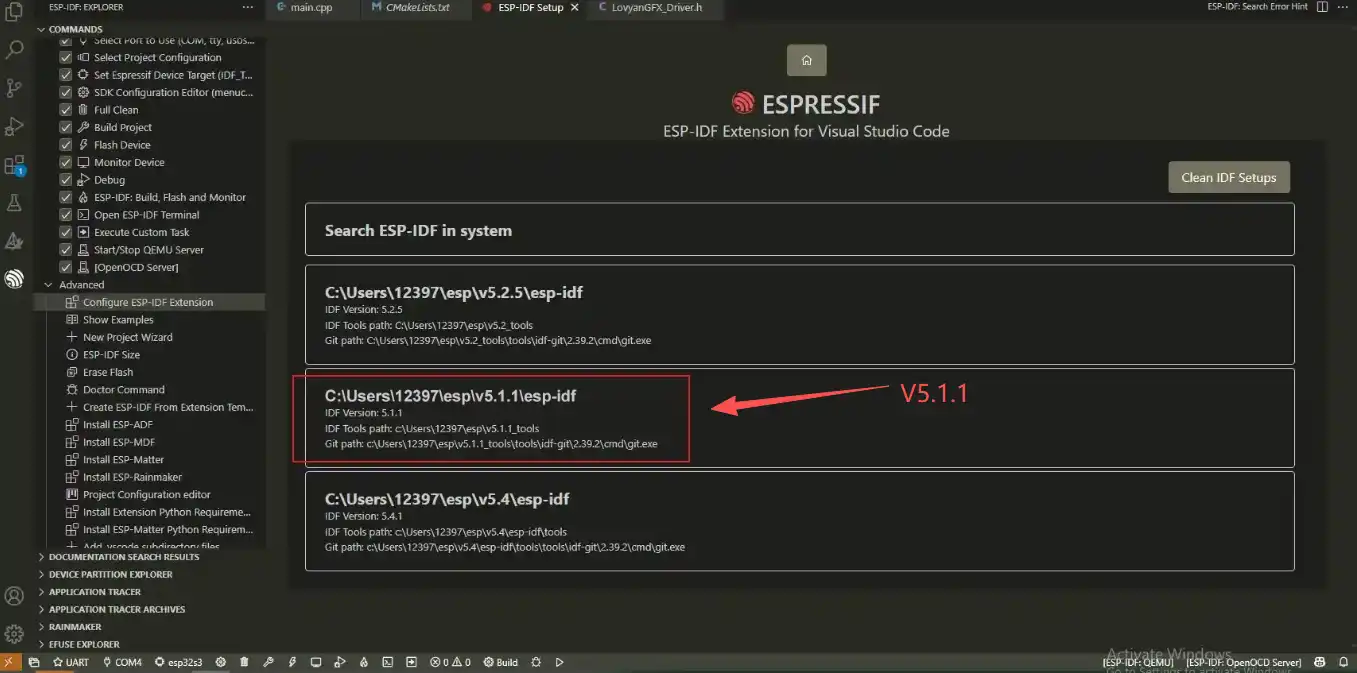 Select version idf v5.1.1. (Note: If you have previously installed other versions of IDF, you need to install version v5.1.1 first and then make the selection.)