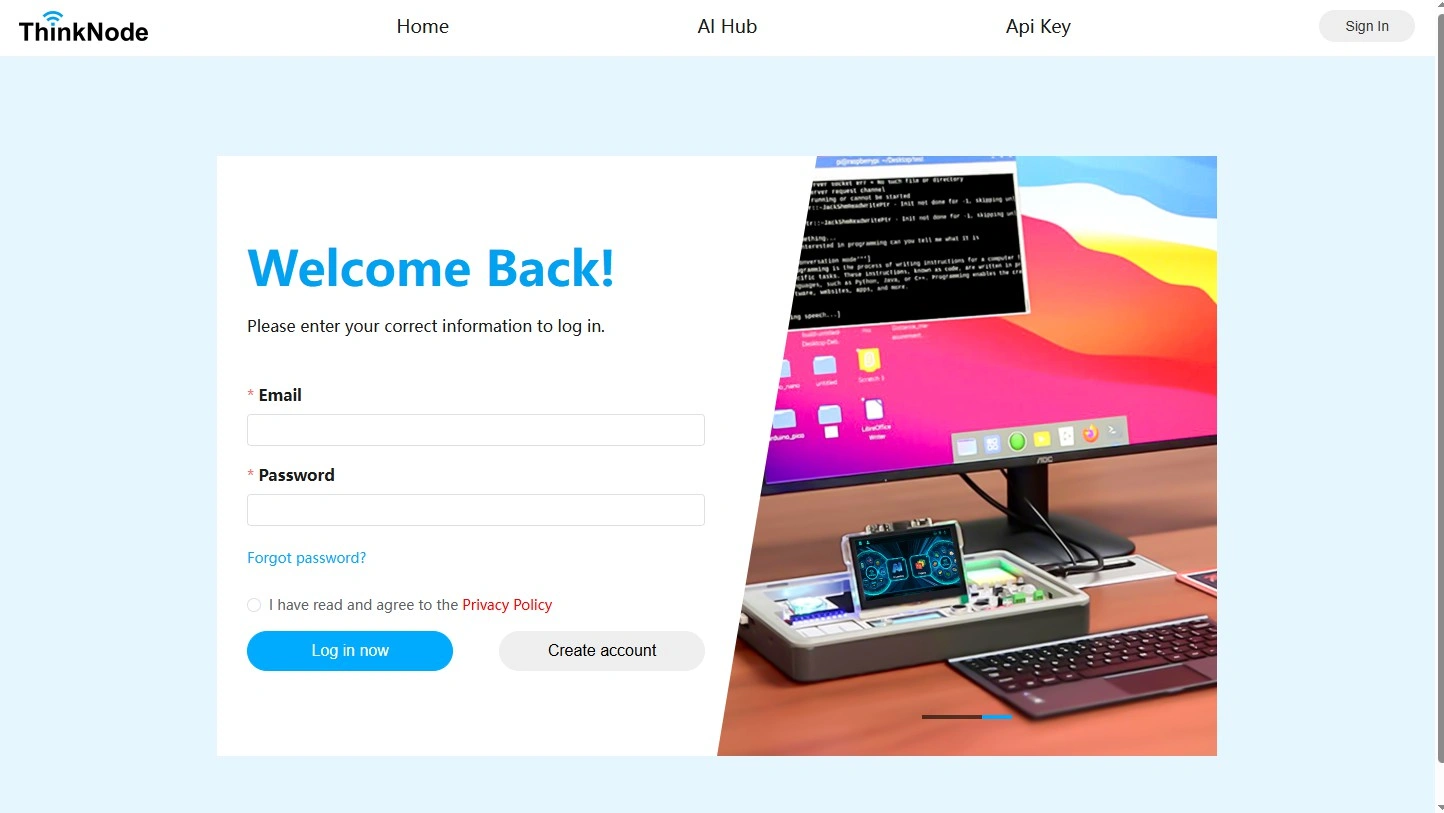 - Open a browser and go to https://portal.thinknode.cc/ to access the AI Hub interface. If this is your first time logging in, you need to click the "Create Account" button to create an account.