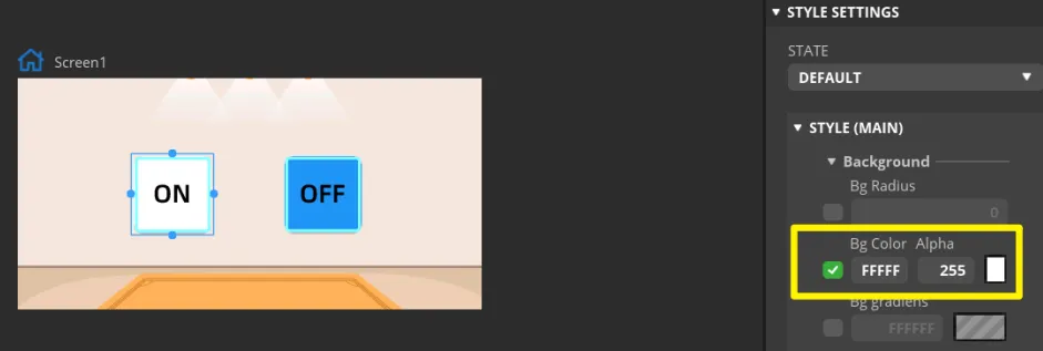 In "Inspector"->"STYLE SETTINGS"->"STATE", set display white background color by DEFAULT and red when on the PRESSED state.
