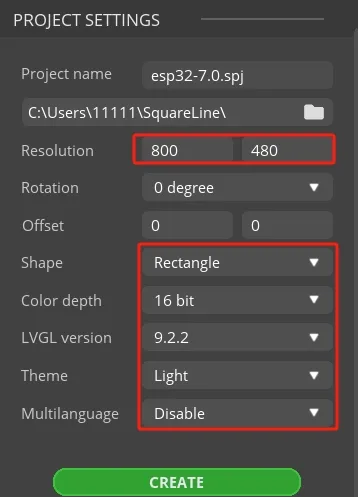 Set the name of the project, set the screen resolution to 800*480, set the color depth to 16bit, and keep other default settings. After setting, click CREATE to create the project.