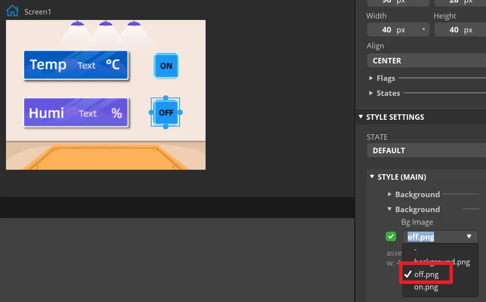 Add an identification symbol to the button. The button in this tutorial controls the LED switch, so you only need to mark the button "on" and "off". You can add LABEL widgets or add a background images to the button. This tutorial will demonstrate how to add a background image to a button.