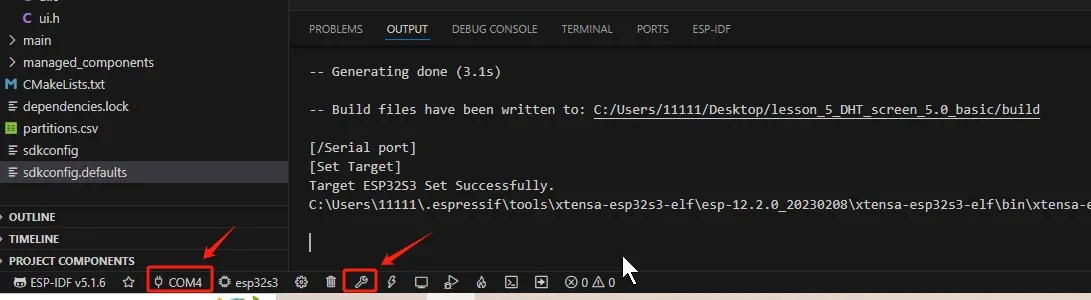 After the program is successfully downloaded, connect the DHT20 sensor to the IIC port and the LED to GPIO_D (IO25), the temperature and humidity values will be displayed on the screen. Click the ON button on the screen and the LED will turn on. Click the OFF button and the LED will turn off.