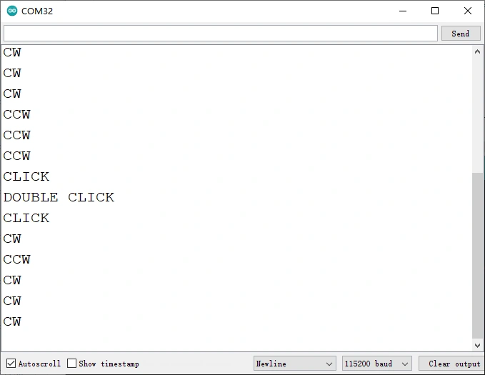 Encoder sample program, which only outputs the rotation direction (CW/CCW) and button clicks (single click/double click) to the serial port.