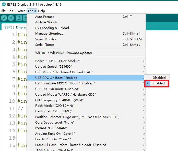 ②When using UART to download programs, a USB-to-TTL converter is required. When viewing serial port data, there is no need to enable USB CDC on boot.