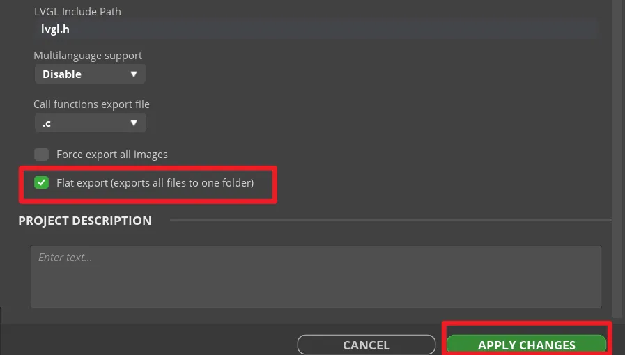 Fill in lvgl.h in LVGL Include Path. Check "Flat export(exports all files to one folder )".
