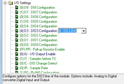 Now we will set up the other XBee so that it will listen to changes on pin D3. Connect it to the FTDI cable and read in the current configuration just like the first one.