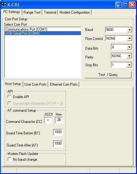 One XBee will act as the 'reset transmitter', it will be attached to the computer via USBSerial adapter and wireless send programming commands to the receiver. Lets set this one up first