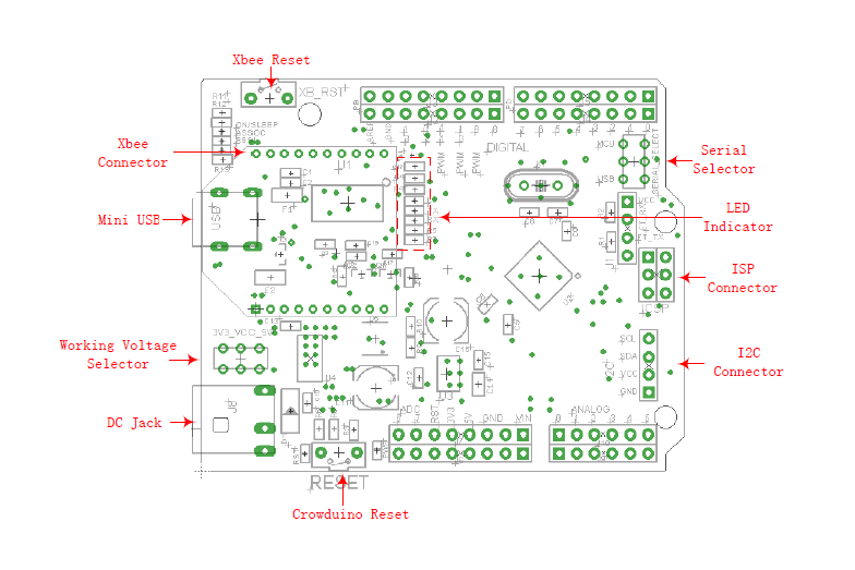 Crowduino differs from all preceding boards in that it contains Shield and XBee socket . it adapts to all the shield that compatible with arduino Uno. it also adapts to the Xbee modules from Digi,and any module with the same footprint.