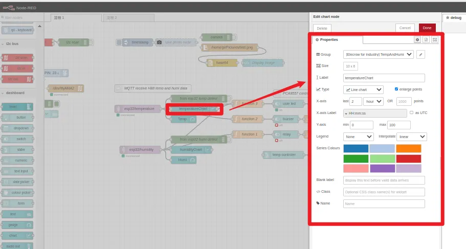 Double click the chart node. Select the [Elecrow for industry] TempAndHumi for the "Group". (If you have not created the panel, please follow the gauge node settings above to create it)