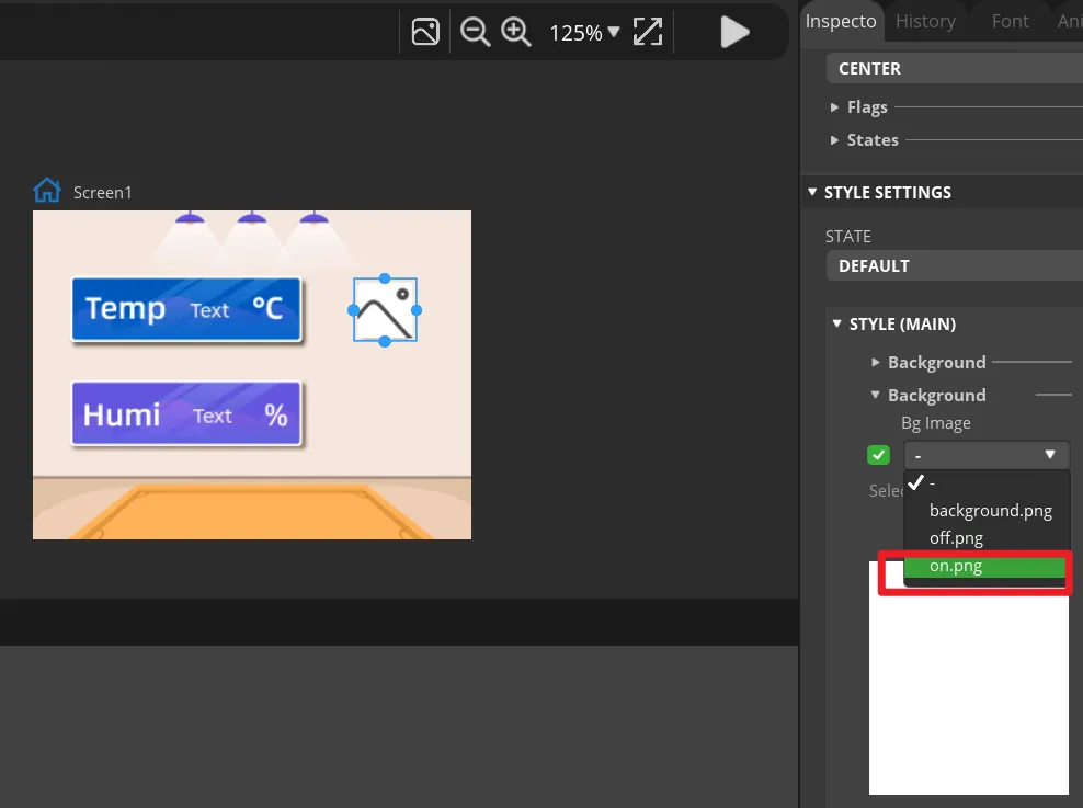 Add an identification symbol to the button. The button in this tutorial controls the LED switch, so you only need to mark the button "on" and "off". You can add LABEL widgets or add a background images to the button. This tutorial will demonstrate how to add a background image to a button.