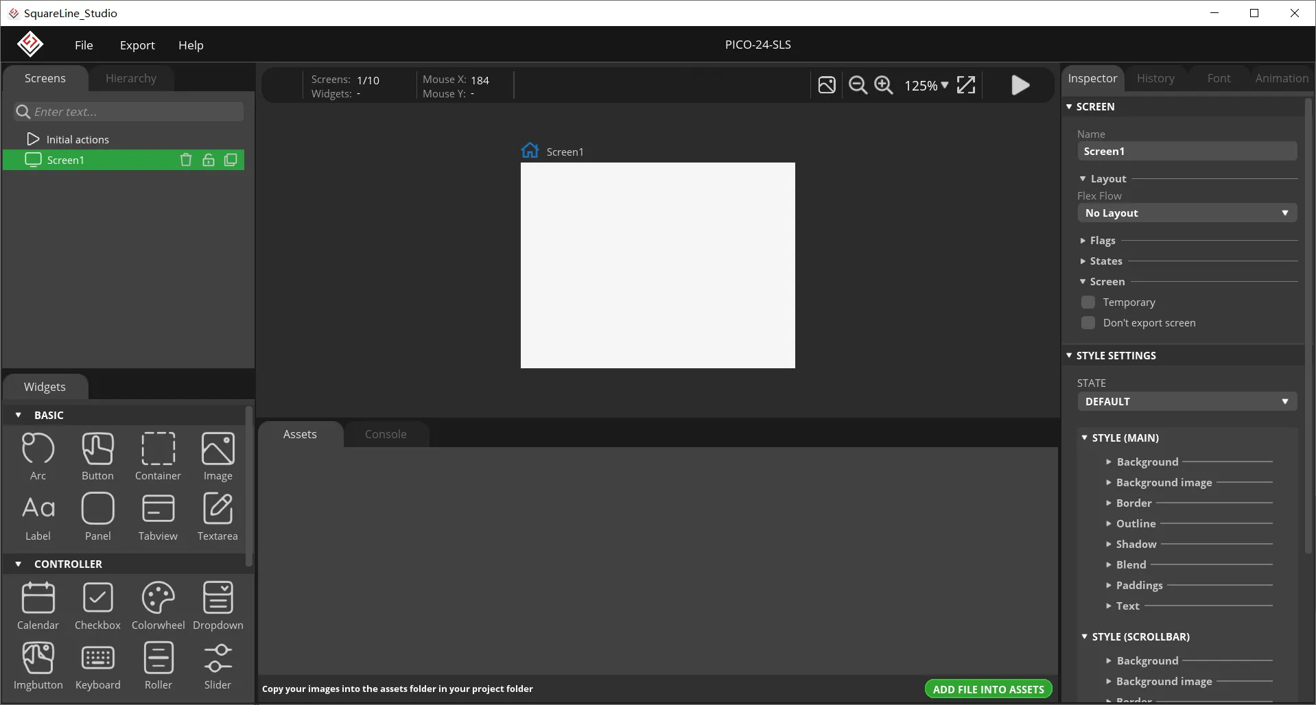 Click "Button" in the "Widgets" area, and "Button1" will be added to the current Screen.