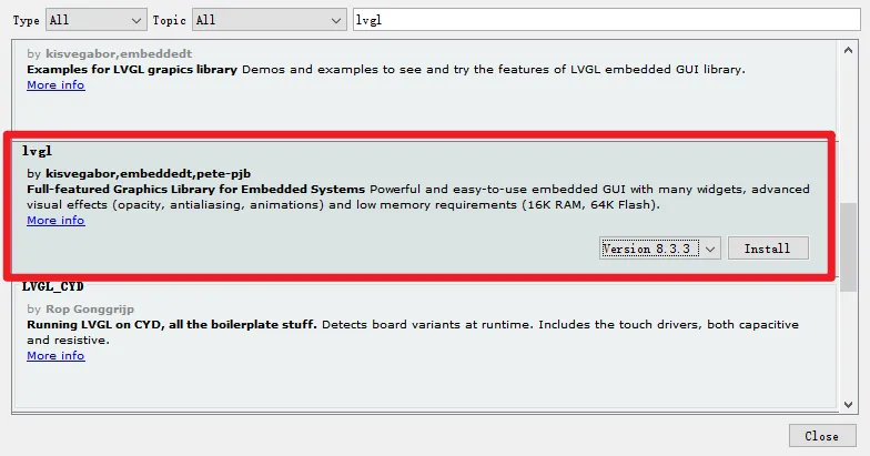 If you install the lvgl libraries by Library Manager, you need to copy the demos folder and examples folder and paste them to src folder. And modify the lv_conf_template.h file and rename it to lv_conf.h, and place it in libraries folder.(Please refer to the library provided)