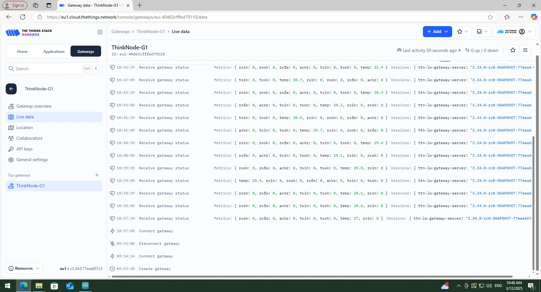 A gateway has been created on The Things Network (TTN), and the gateway is connected and operating normally.