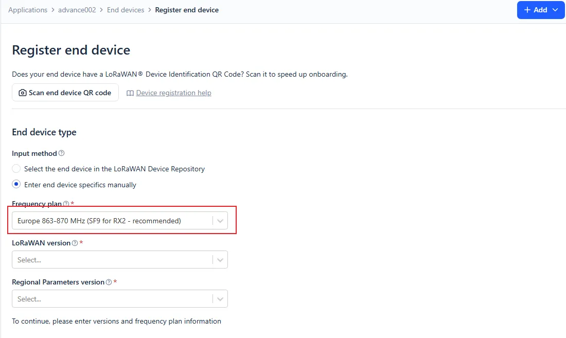 Set the Frequency plan.Note that the frequency band range should be consistent with that of the gateway you are using.
