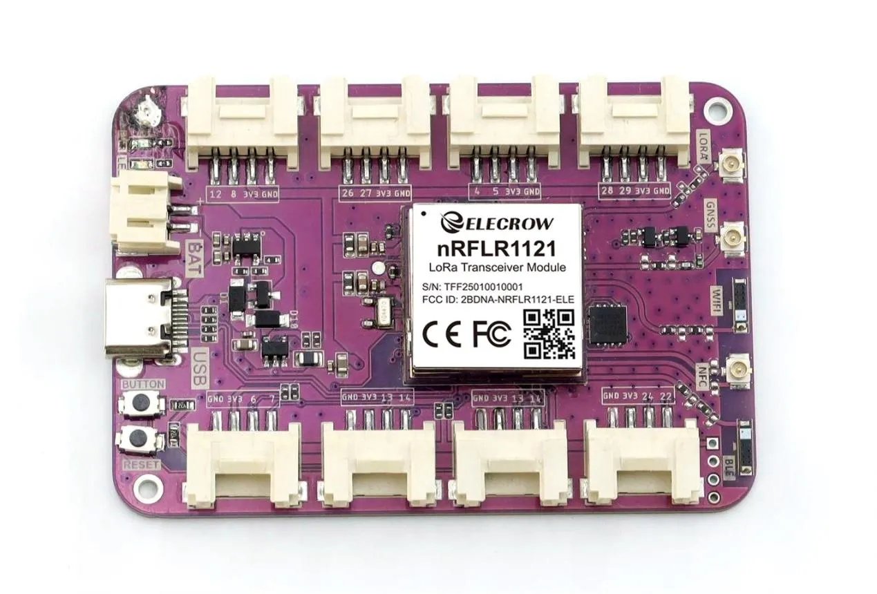 The Elecrow nRFLR1121 module integrates the Nordic nRF52840 microcontroller and the Semtech LR1121 LoRa transceiver chip. It is a high-performance, low-power, long-range transceiver module. It supports Bluetooth 5.3 and low-power Bluetooth, complies with the A, B, and C classes of the LoRaWAN 1.0.4 specification. And it supports LoRa point-to-point (P2P) communication mode, covering the 850~930MHz (applicable to 868MHz, 915MHz) global ISM frequency band, with a maximum transmit power of +20dBm, a transmission rate range of 1.91~62.5Kbps, and a transmission distance of up to 10 km. In addition, the module supports ground ISM band communications, covering the global 2.4GHz spectrum and Sub-GHz band, and also supports S-band LR-FHSS (Long Range - Frequency Hopping Spread Spectrum) technology for satellite connection (the two cannot work at the same time). This makes it suitable for remote areas without ground network coverage, such as environmental monitoring of meteorological stations and hydrological stations and transmits data to the central server via satellite communication.