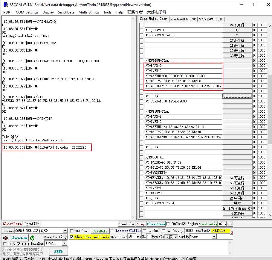 Enter the above AT commands in sequence on the extended interface of the serial port assistant. When you enter the "AT+JOIN" command, if "DevAddr" appears, it indicates that the nRFLR1121 node module has successfully joined the network!