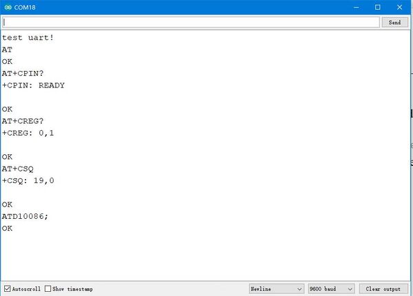 4. After the upload is successful, open the serial port monitor, the baud rate is set to 9600. Then send a command to call.