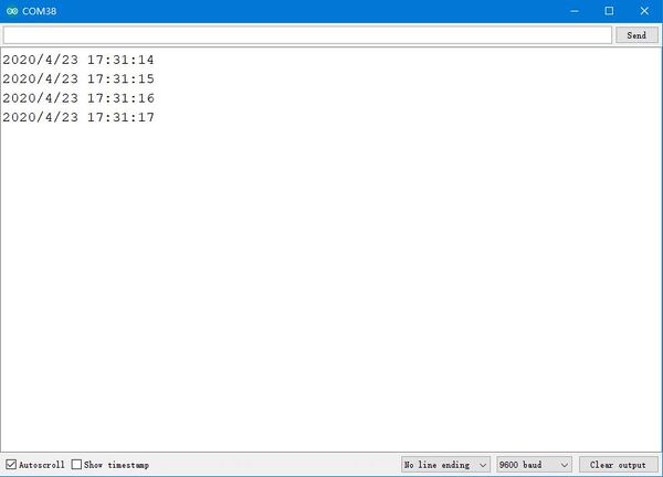 5. After the upload is successful, open the serial port monitor, the baud rate is set to 9600. You can see the time when the serial port is printed out.