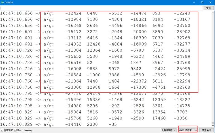 STEP6 After the program is downloaded, open the Serial port monitor of Arduino IDE, set baud rate to 38400, turn the sensor, and the printed value will change, as shown in the figure