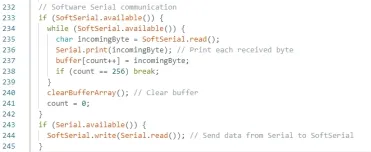 In this while loop, as long as there is available data on the software serial, the loop body will continuously execute. The SoftSerial.read() function reads a byte of data from the software serial and stores it in the incomingByte variable. Then, the received byte is printed to the hardware serial (usually connected to a computer for debugging and data monitoring) using Serial.print(incomingByte). Next, the received byte is stored in the buffer array, and the count variable is incremented to track the number of bytes stored. When count reaches 256, the loop exits to prevent an array overflow.