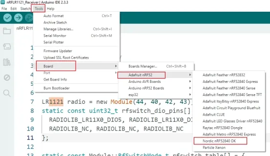 Since the nRFLR1121 uses the nRF52840 as the main control chip, you need to install the nRF52 development board.